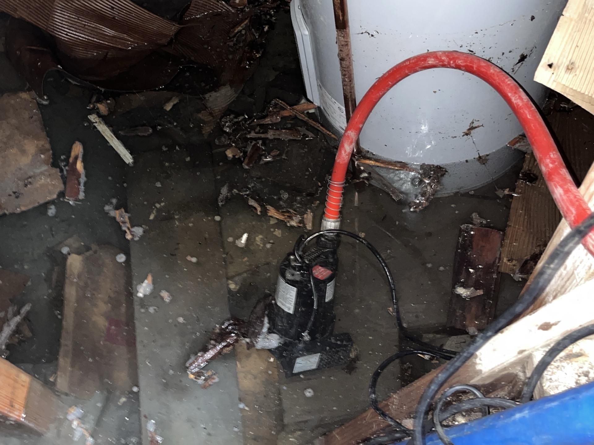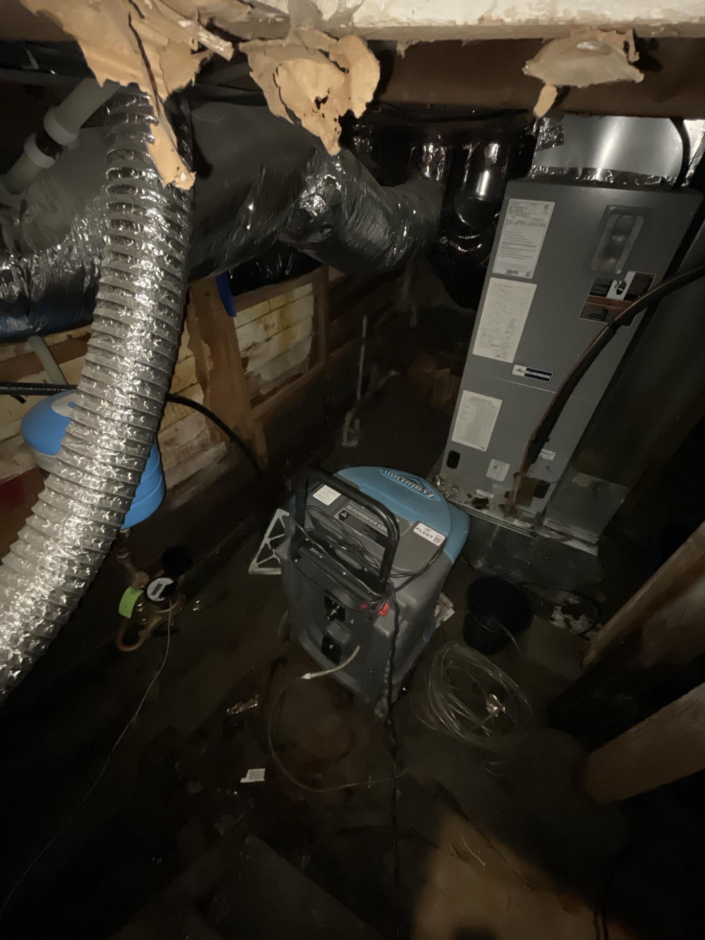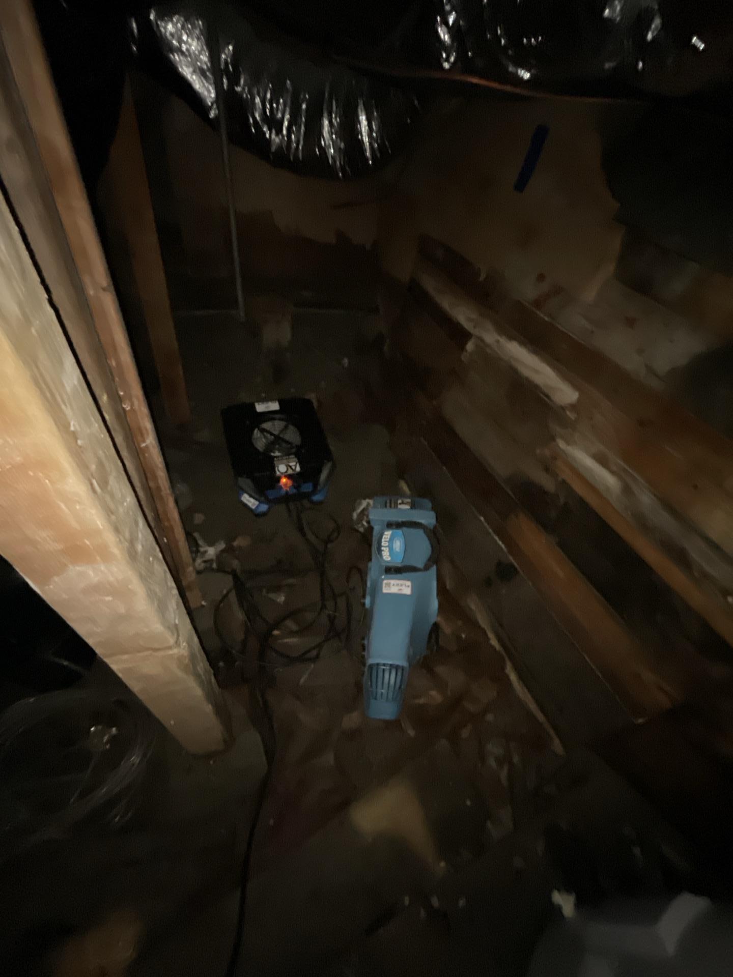 Technicians performed a detailed crawlspace inspection to identify the source of the water intrusion. To stabilize the environment and prevent microbial growth, an extra-large industrial dehumidifier and a low-profile air mover were installed to reduce humidity and circulate air across the saturated ground. While the tenant coordinated an electrician to hardwire the condensation pump, our team initiated a professional drying phase and established a monitoring schedule to ensure the space remains free of mold and structural dampness.