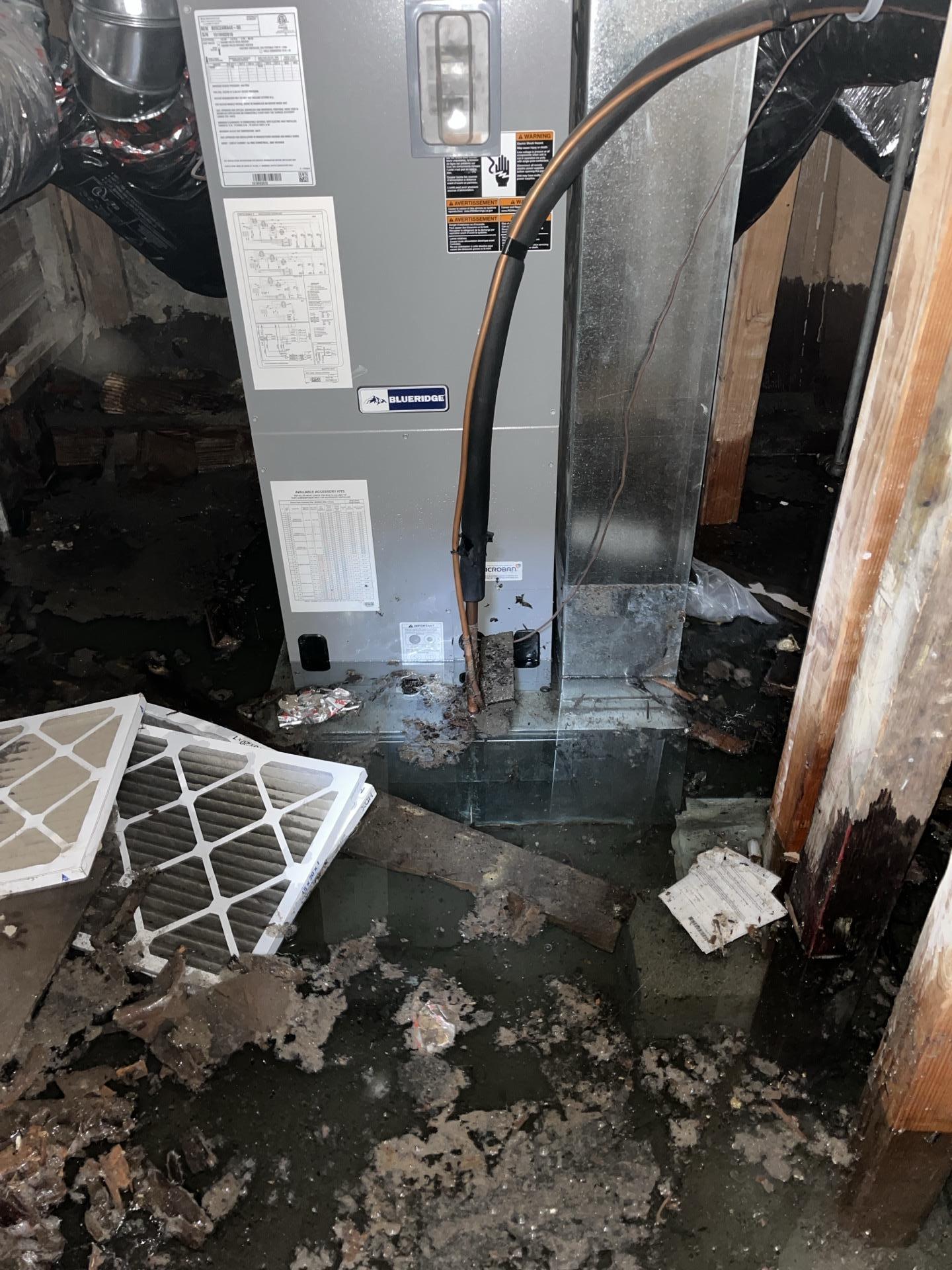 The tenant reported excessive moisture and standing water within the crawlspace. An inspection revealed that a disconnected condensation pump and leaking condensation line were saturating the dirt floor, leading to soft ground conditions and elevated humidity levels.