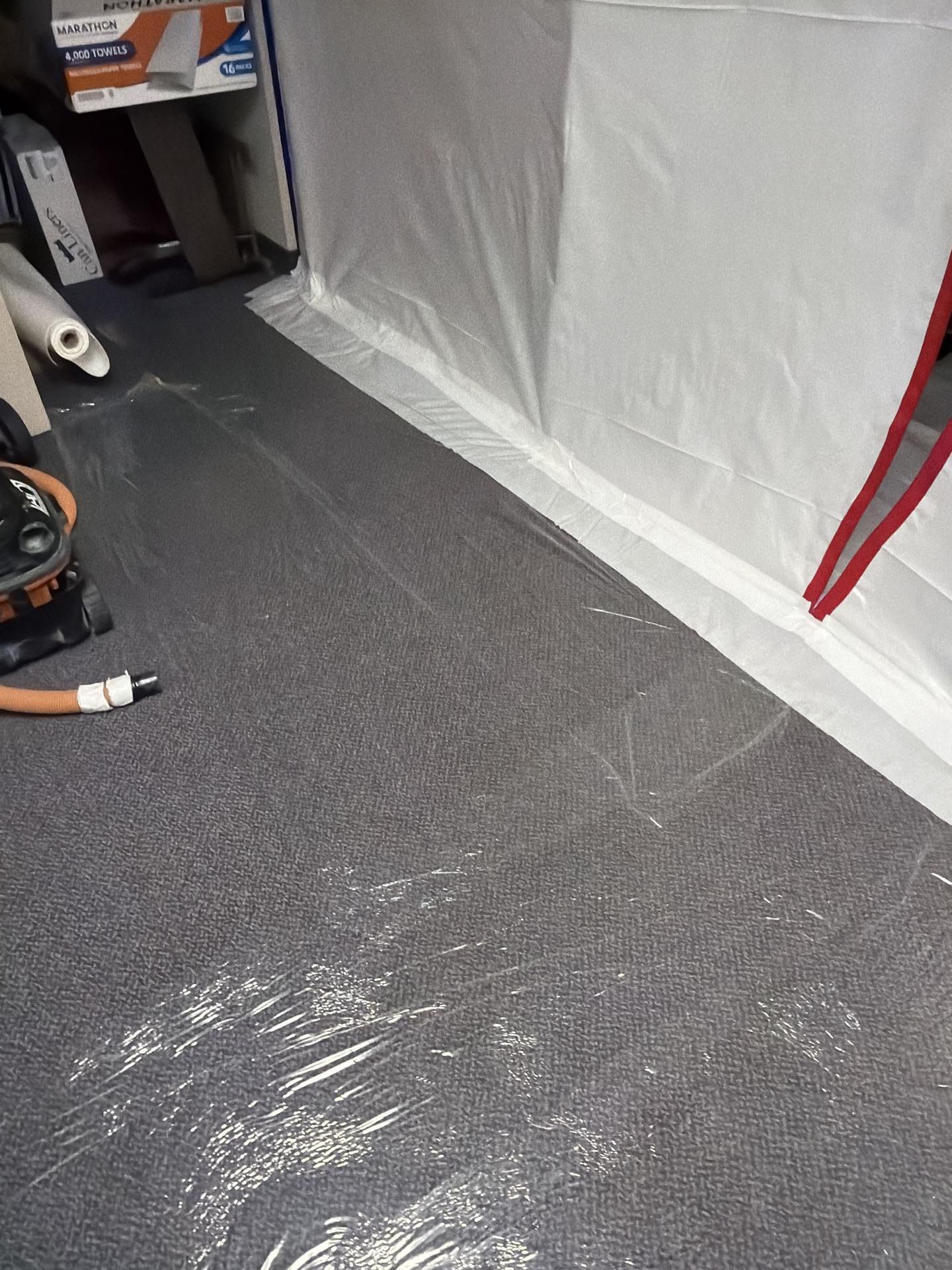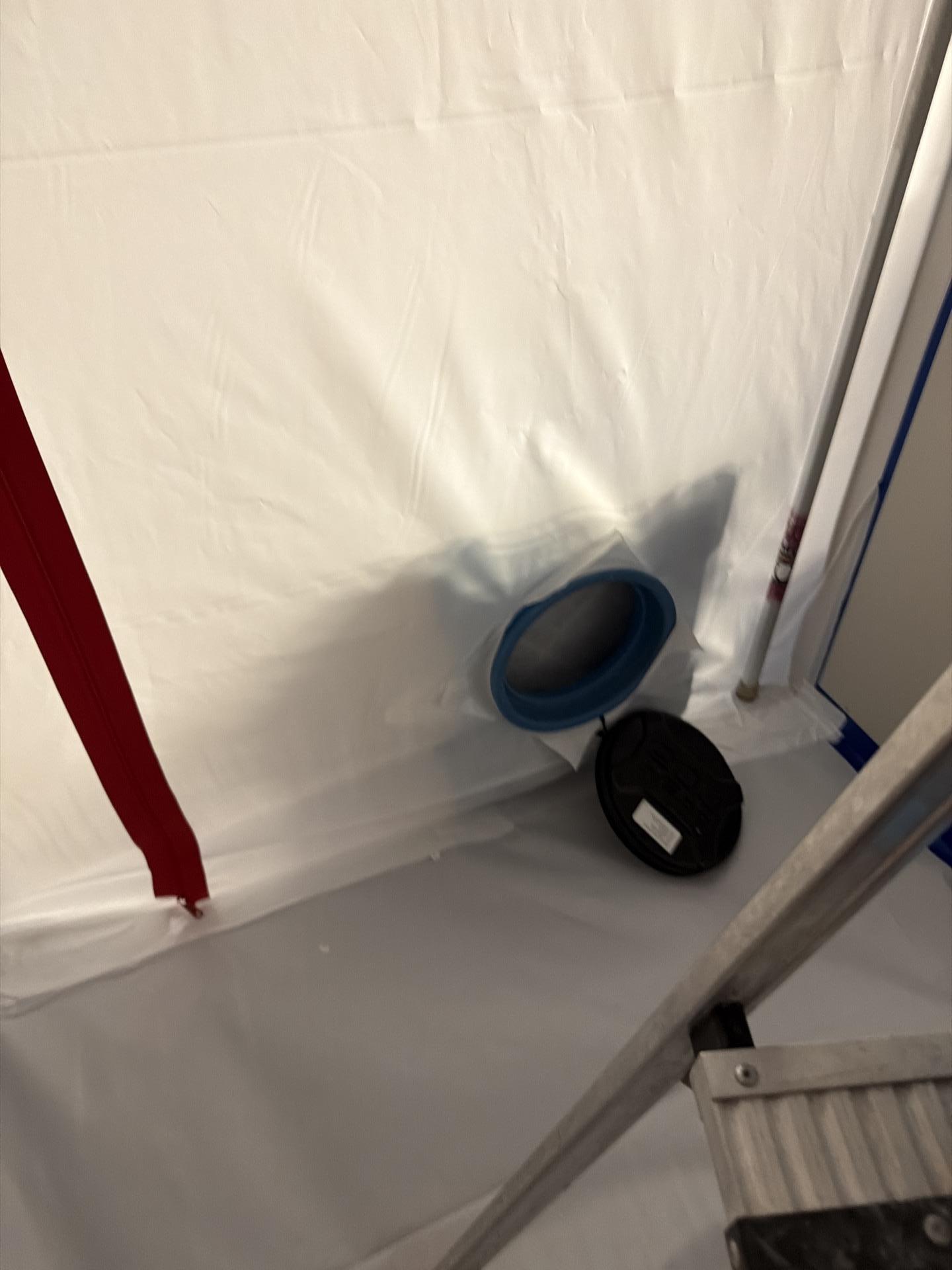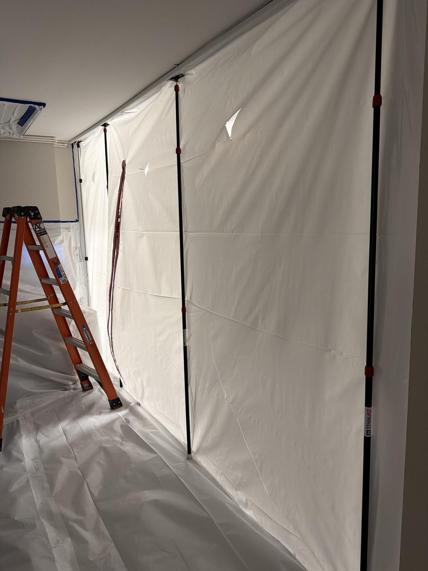 Our team promptly contained the working area using 6 Zip poles and a double layer of sheeting. Contents were shifted, and AC vents, cabinets, and tables were carefully covered. A Hepa 500 air scrubber was placed to maintain air quality. We performed demolition, removing most of the affected double-layer Sheetrock, batt, and blown-in insulation. Subsequent touch-up demolition was performed, and the containment wall was expanded to remove all remaining affected drywall. Mold cleaning was successfully performed, and upon completion of the mitigation job, the containment wall was removed.